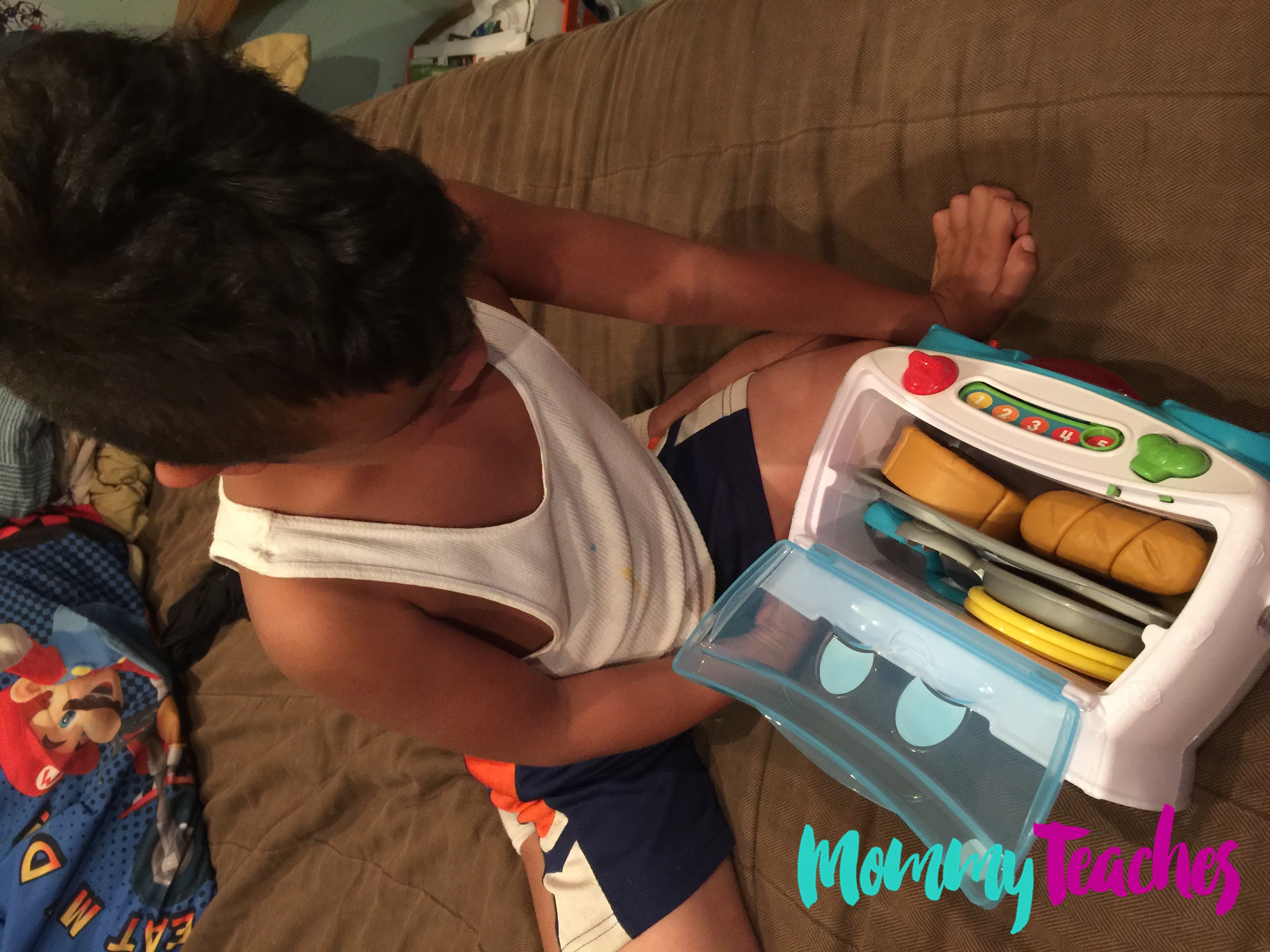 The smallest detail, “wash your hands before you cook,” reeled me right in! I think it’s important to remind our children about the importance of hygiene while cooking but also (the point of this game!) teach them number recognition, provide songs for interaction, and encourage them to use their imagination. This is what this little oven does. My boy was able to apply what I do in the kitchen to use his own imagination while listening to songs with a variety of vocabulary words and rhyming as well. We “cooked in the kitchen” together and he had a blast!